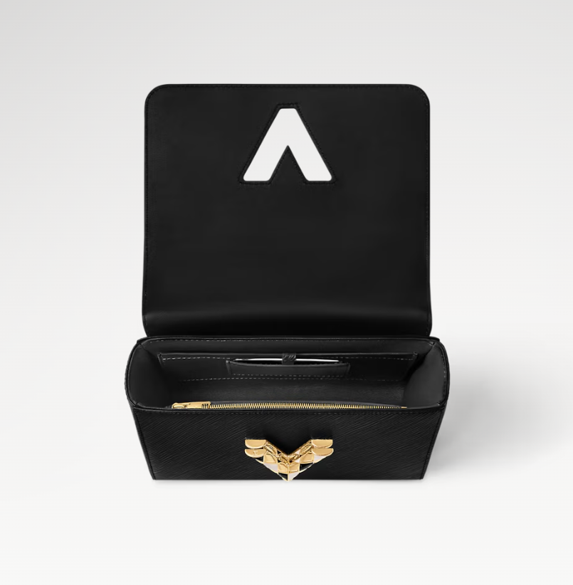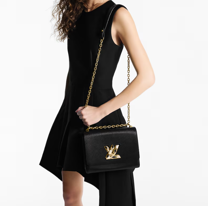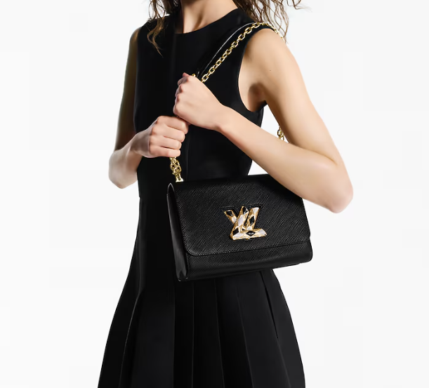 This medium-sized Twist handbag features an elegant design crafted from Epi leather, accented with a vibrant enamel LV Twist lock. A striking sliding chain shoulder strap allows for crossbody or shoulder carrying, while interior pockets, a detachable mirror, and a zippered compartment provide organized storage for everyday essentials.