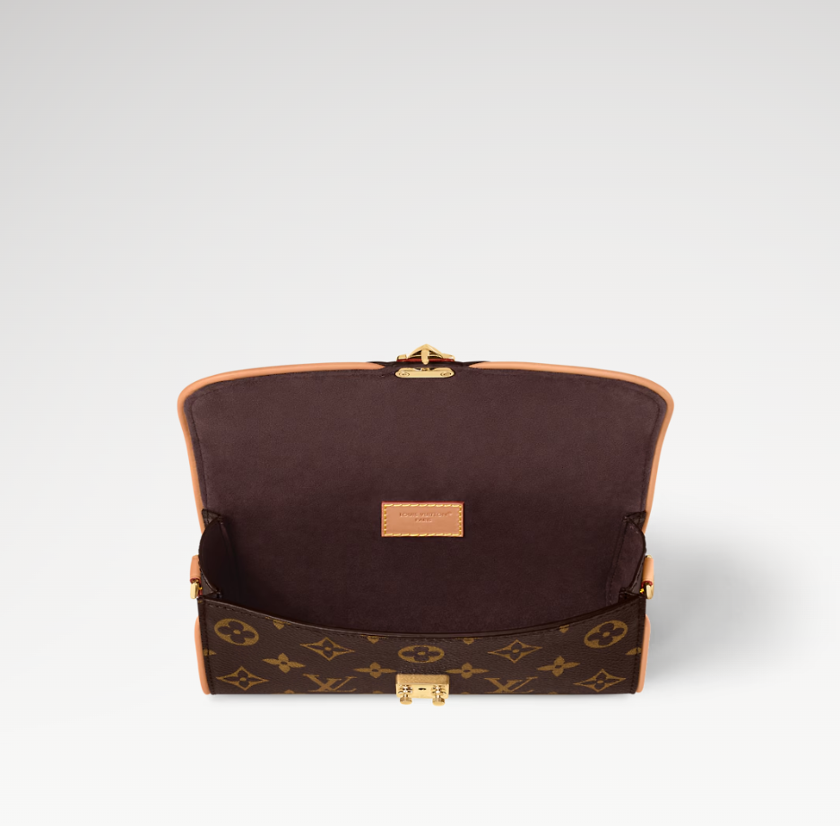 This Pochette Camille handbag is crafted from Monogram canvas, paying homage to the original design that debuted at Louis Vuitton's Spring/Summer 2000 fashion show. The S-Lock clasp, the LV Circle logo on the chain, and contrasting VVN leather trim embody classic brand elements. Its versatile design makes it suitable for crossbody, shoulder, or hand carry.