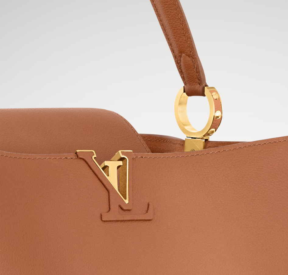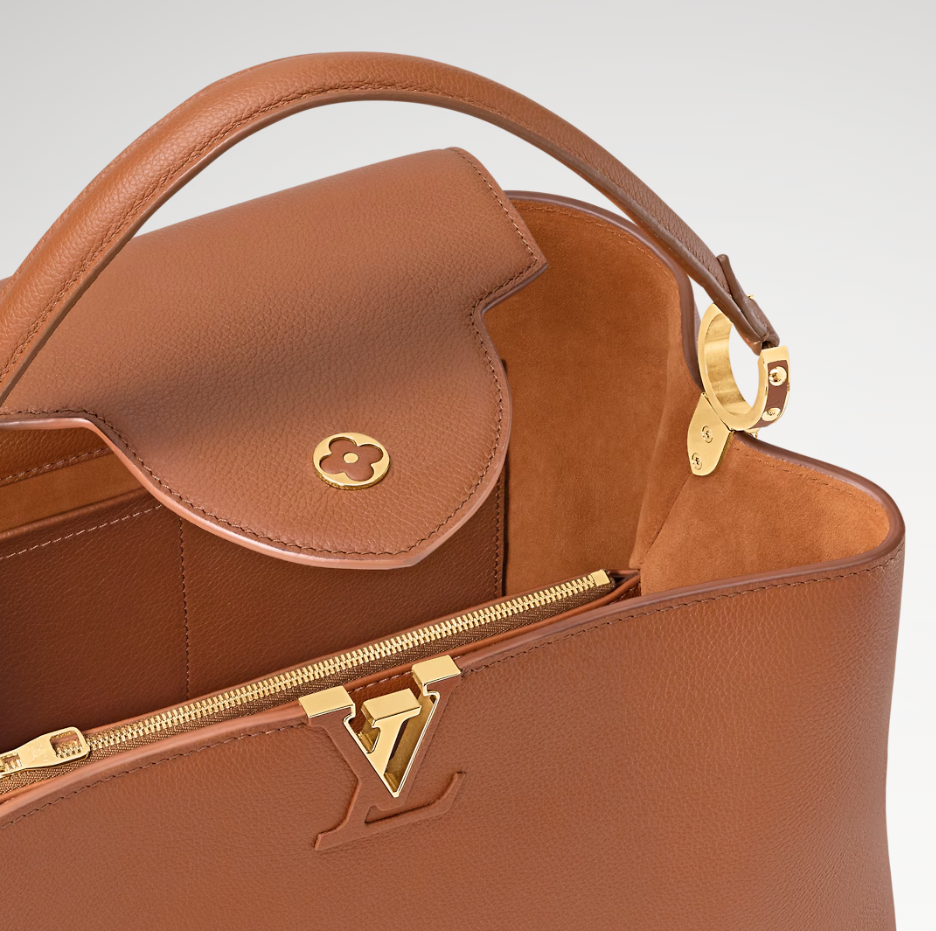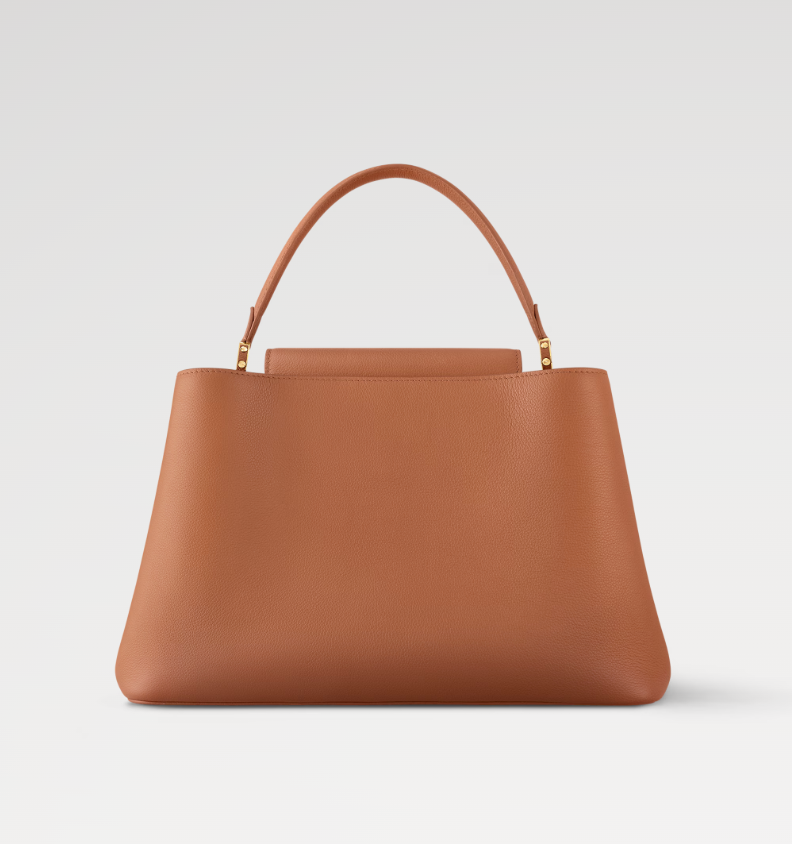 This Capucines Souple large handbag utilizes a tanning process to give the glossy grained cowhide leather a supple texture, presenting an enlarged version of the brand's classic silhouette. Its ample space is suitable for daily commutes and weekend outings.