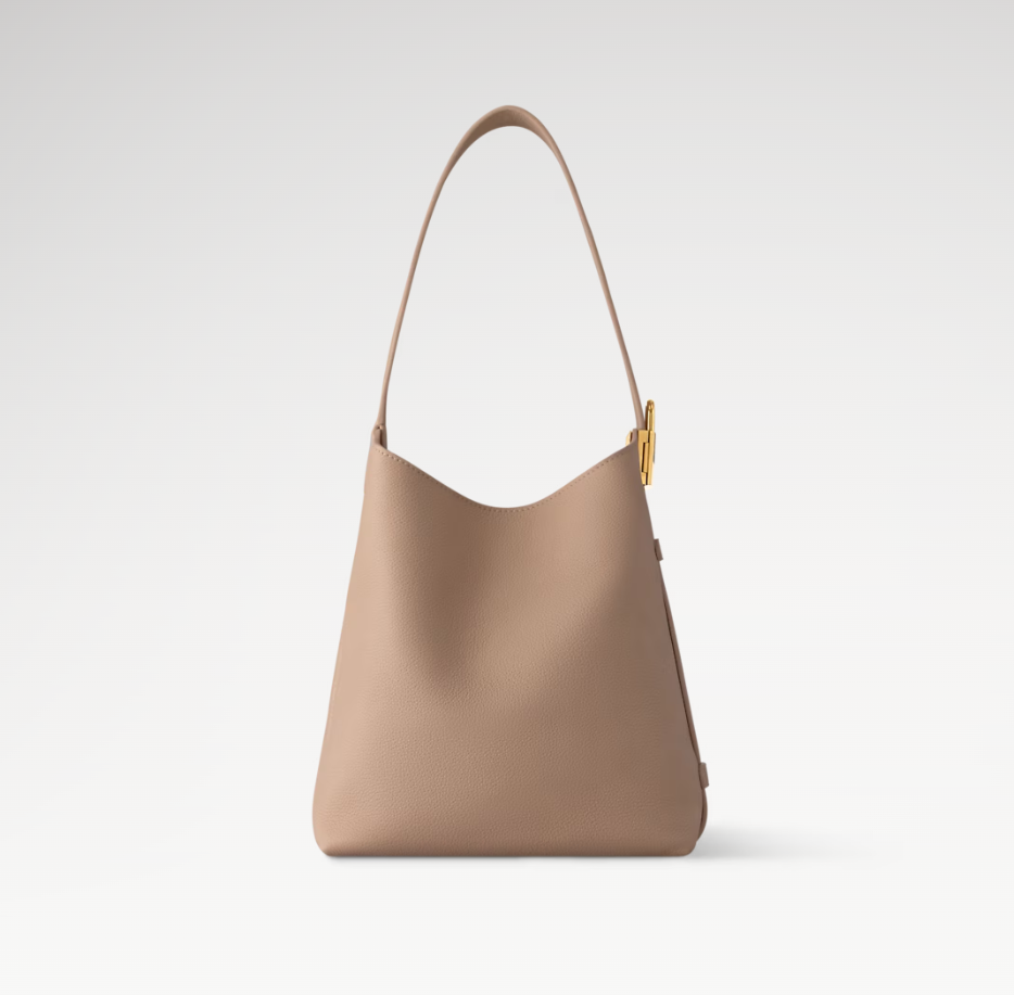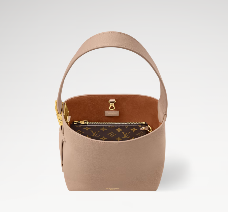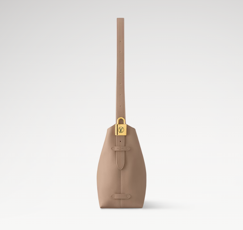 This Low Key Hobo PM is a sophisticated everyday handbag crafted from supple calfskin and adorned with antique gold-tone hardware, including a signature padlock. The bag is sized for essentials and features a detachable Monogram pocket for securely storing valuables. It can be carried crossbody, over the shoulder, or by hand.