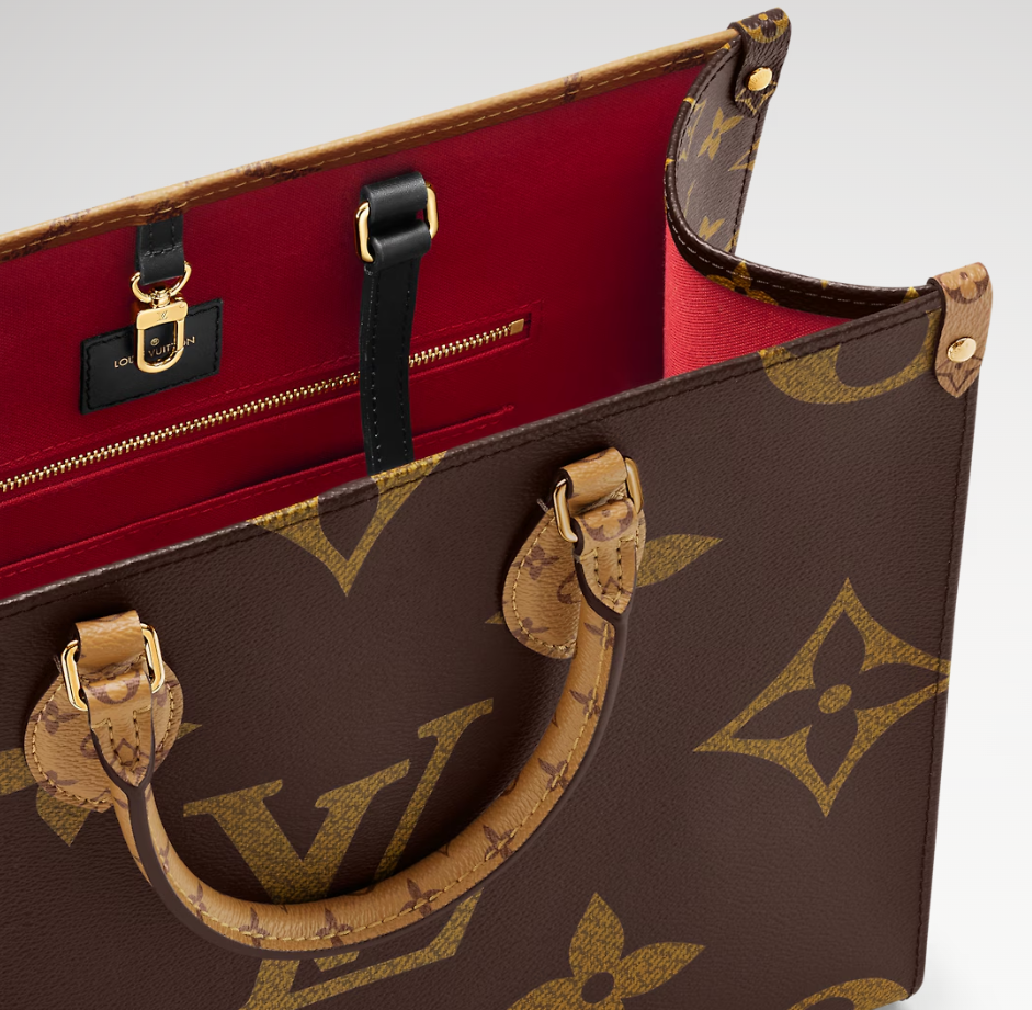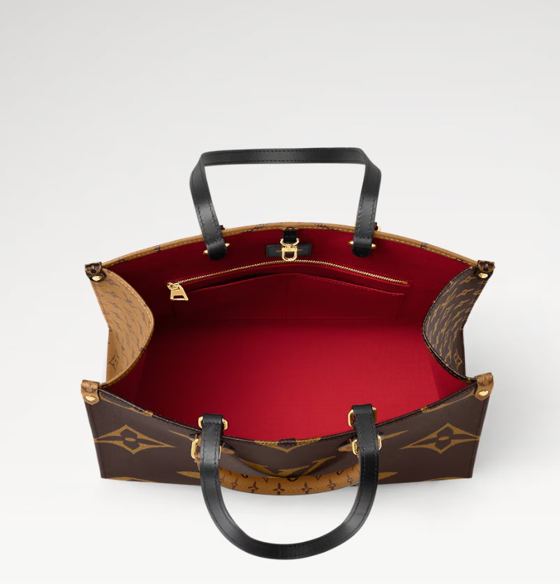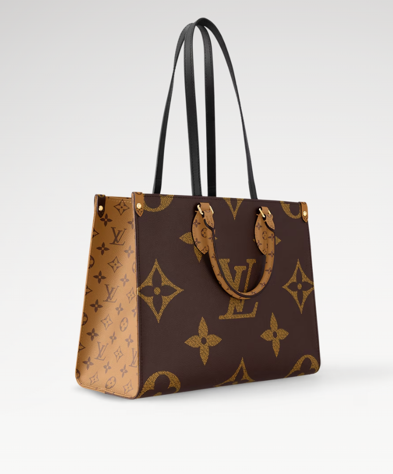 The Onthego medium-sized handbag features classic Monogram canvas on one side and Monogram Reverse canvas on the other, offering a variety of stylish looks. The Toron handles and shoulder strap allow for multiple carrying options.